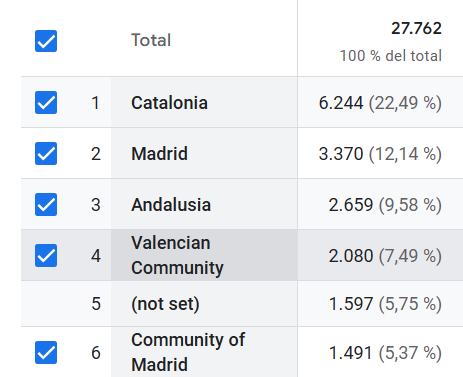 Cataluña y Madrid siguen siendo las comunidades desde las que más se accede. Aumenta el número de accesos en cada una de ellas, aunque su porcentaje disminuye debido al crecimiento del resto de comunidades. Hay que tener en cuenta que deben sumarse los resultados de “Madrid” y “Community of Madrid”. Se ha pasado de 20.887 usuarios a 27.762, un crecimiento del 33%, aumentando en todas las comunidades.